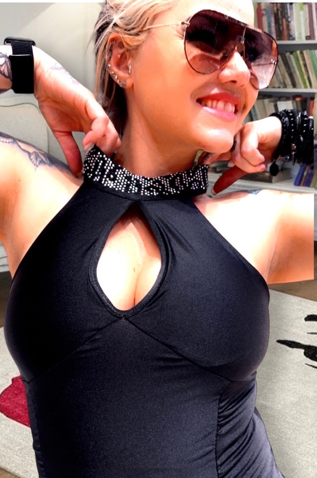 Blusa Lycra com de amarrar no pescoço com pedraria na gola.. Lycra premium com muito elastano e pedraria de alto brilho
