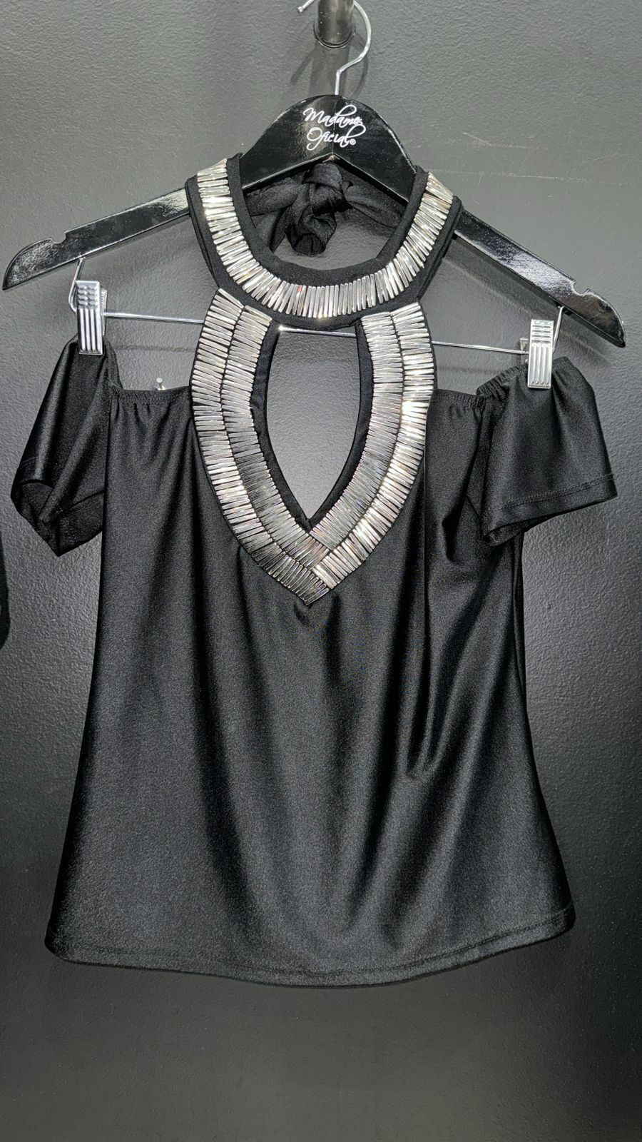 Blusa Lycra frente única com pedraria bordada. Tamanhos P e M. Veste P 36 ao 38 e M 40 ao 42. Lycra premium bordado manual.