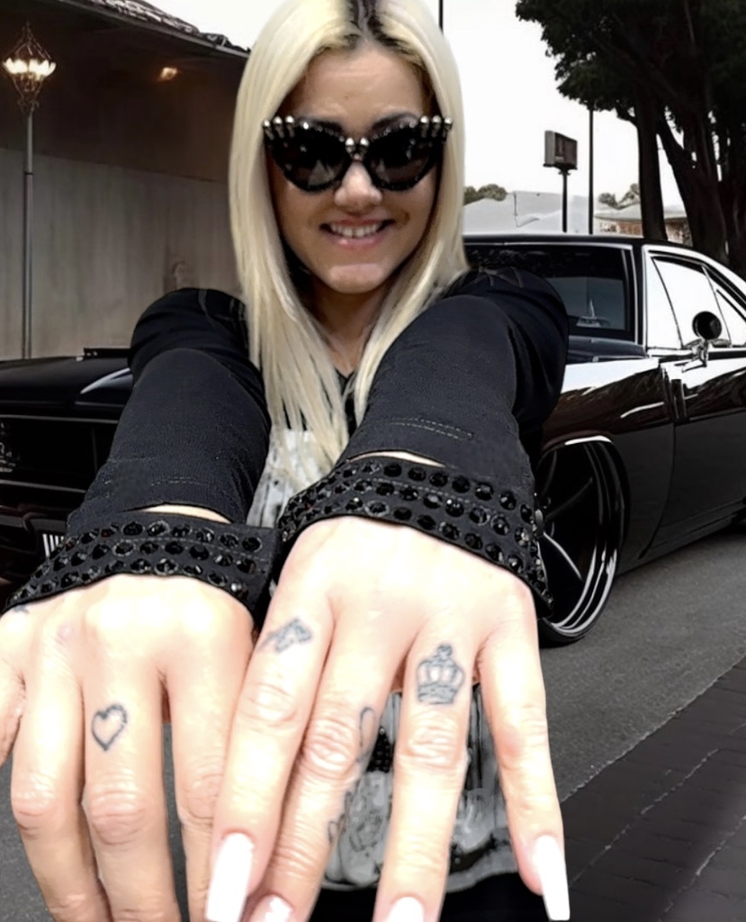Blusa manga longa com estampa, pedrarias e pulseira de pedraria.