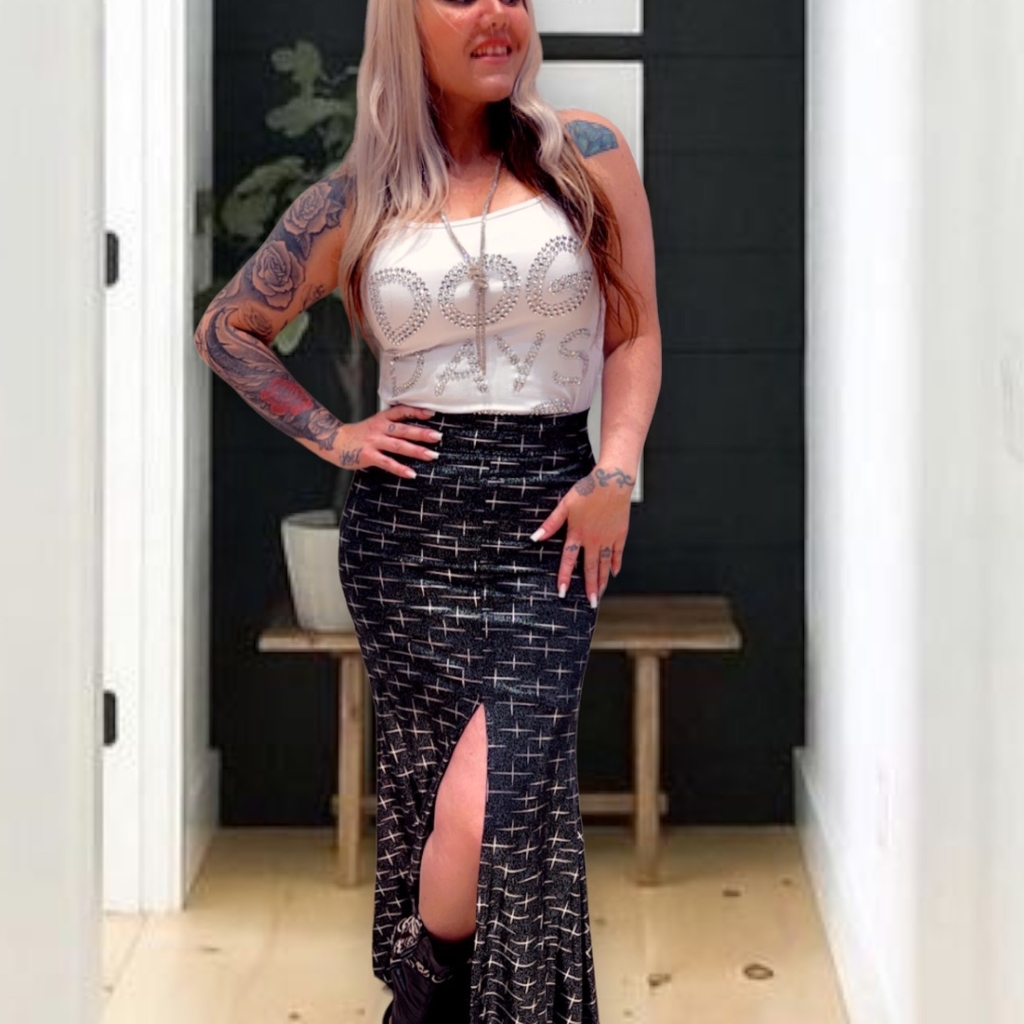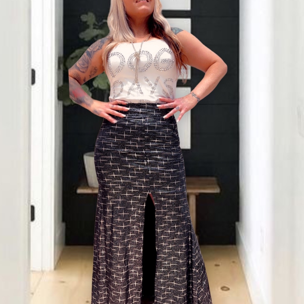 Saia longa tecido metalizado e fenda. Apenas cor da foto. Tamanho P veste 36/38
