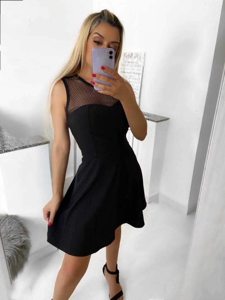 Vestido Dark com detalhes de pedrarias nas laterais. Crepe Premium com elastano, detalhe de arrastão decote. Com bojo embutido. Tamanho Único (veste 36 ao 38). "Um toque de mistério e glamour! 🖤👗 O vestido Dark com pedrarias nas laterais e arrastão no decote é perfeito para quem quer brilhar com atitude. ✨🔥 #EstiloÚnico"