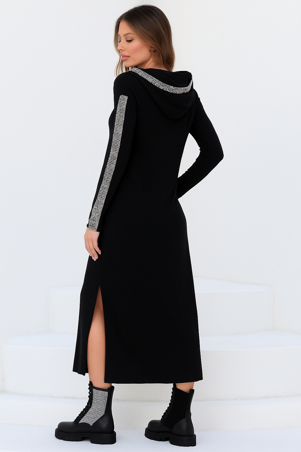 Vestido longo com bolsos, capuz e pedrarias. Tamanho único veste do 38 ao 44.. Pedrarias de alto brilho, tecido viscycra premium com elastano.