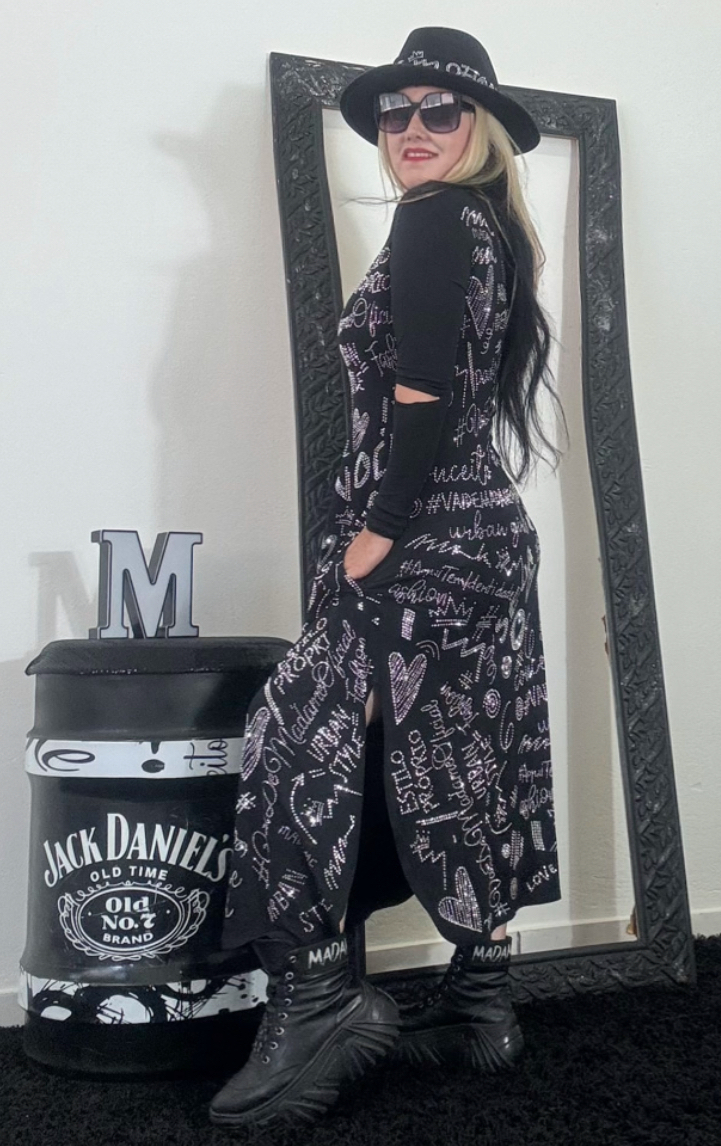 Vestido longo com bolsos, mangas com recortes e pedrarias. Tamanho único veste do 38 ao 44.. Pedrarias de alto brilho, tecido viscycra premium com elastano.