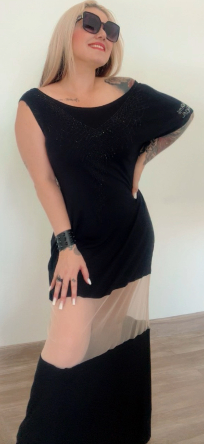 Vestido longo com recorte de tule nude na frente, pedrarias na frente, tecido viscolycra premium com elastano. Tamanho único veste 38 a 48.                                                                        "Um toque de glamour e praticidade! 🌟 é a definição de elegância moderna. 💃✨ #EstiloQueFazADiferença"